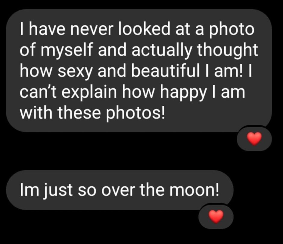 I found this old screenshot from exactly one year ago — a message from one of my beautiful souls right after her first boudoir session with me.